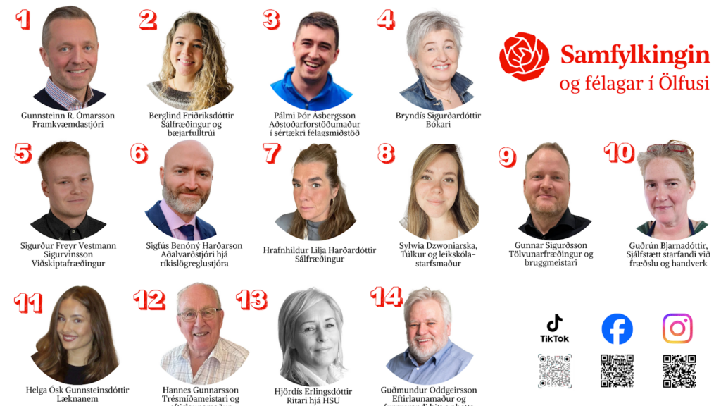 Oddviti listans er Gunnsteinn R. Ómarsson sem var bæjarstjóri í Ölfusi á árunum 2013-2018, á þeim tíma þegar samstillt bæjarstjórn minni- og meirihluta lagði línur og hóf m.a. framkvæmdir við stækkun á höfninni sem leiddi til þess sögulega uppgangs sem hefur verið í Ölfusi síðustu árin. Gunnsteinn er þó ekki mættur til leiks til þess að verða bæjarstjóri á ný, heldur til þess að miðla sinni reynslu inn í bæjarstjórn næstu fjögur árin, en hann starfar sem framkvæmdastjóri Sameykis í dag.